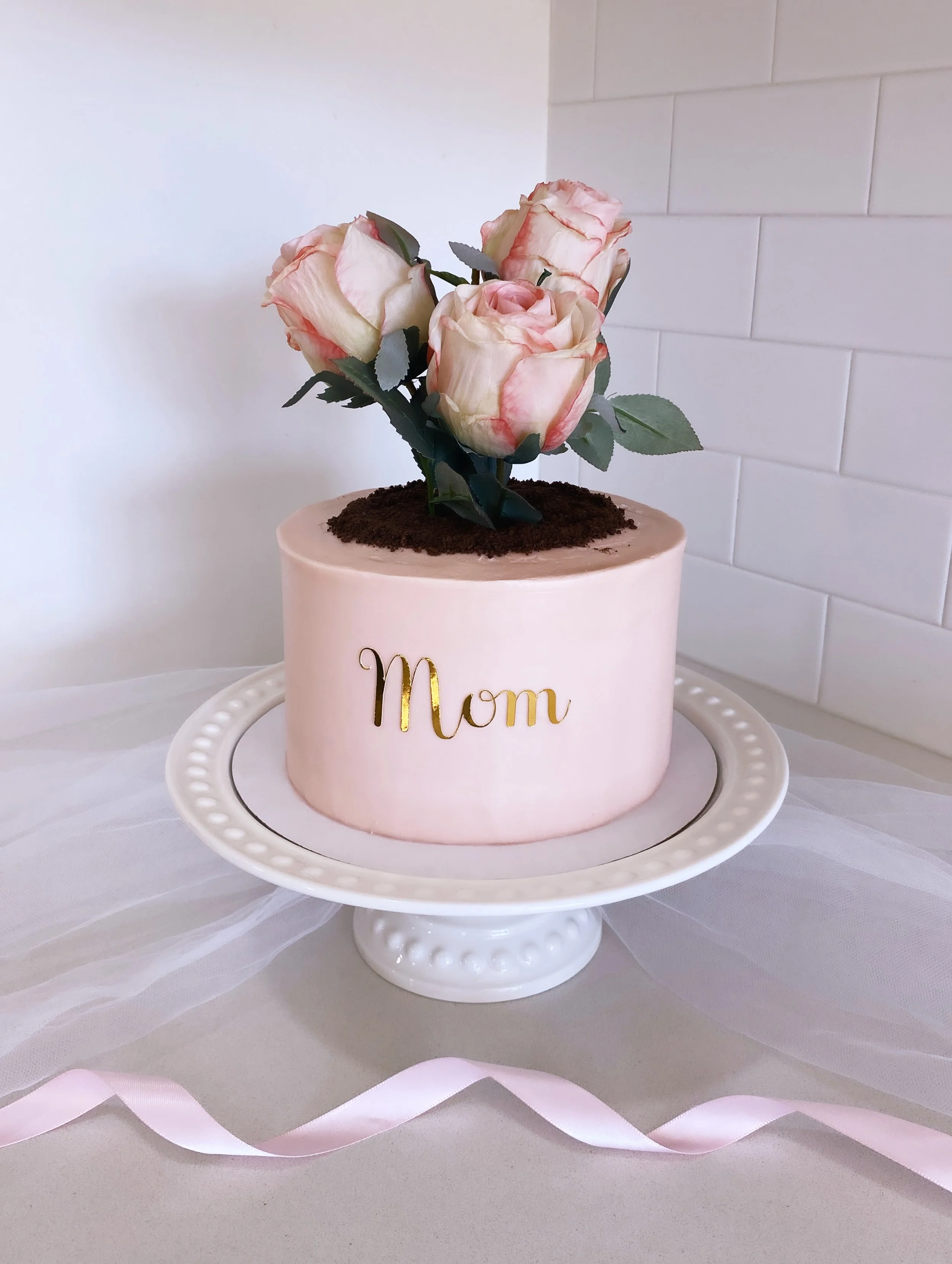 Layers of fluffy vanilla, chocolate or lemon spongecake filled with a whipped, not-too-sweet buttercream. Topped with cookie crumble and a silk floral arrangement. Customize with a personalized charm: mom, mama, nana, mommy…